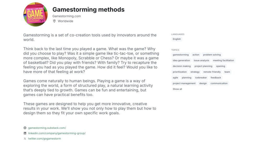 Exploring the library becomes easier when methods are connected to their creators. You can follow facilitators whose work resonates and quickly find related techniques.