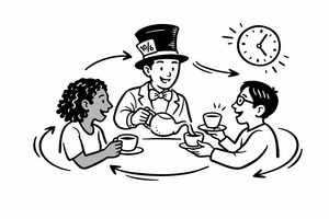 Mad Tea quickly provokes a deeper set of reflections and strategic insights among group members. The questions focus attention and produce a fresh understanding of strategic options and next steps. Participants form two circles, one inside the other.