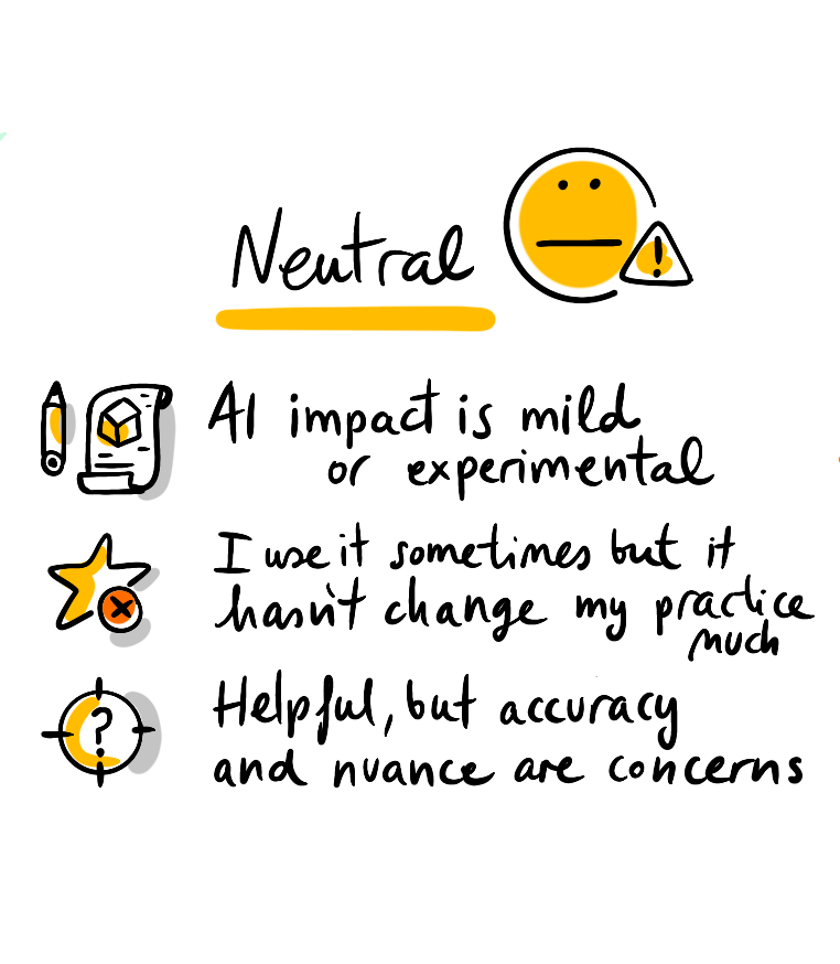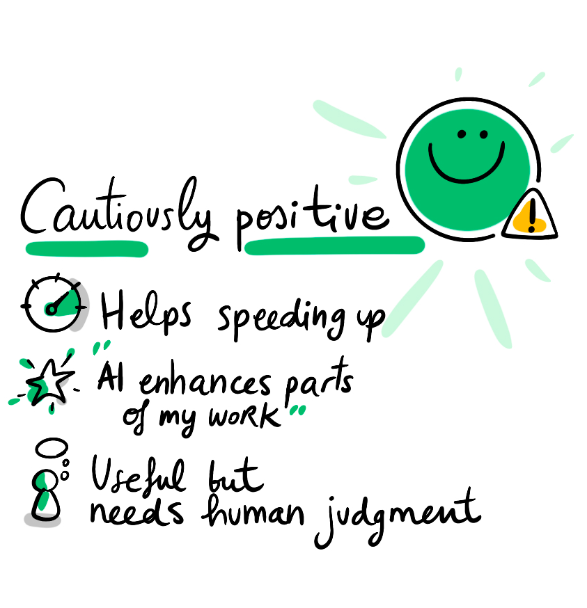 The sentiment analysis summarised below reflects a mostly cautiously positive approach. When asked how AI is impacting their facilitation work, practitioners write about it as a useful helper, but also note quite a few concerns about reliability.
