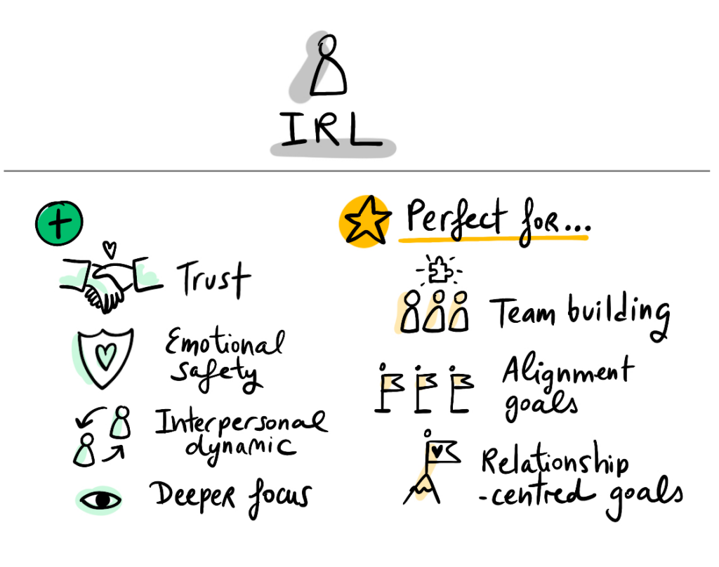 In-person setups are seen as particularly effective for team building, alignment, and relationship-centered goals: situations where subtle cues, energy shifts, and shared physical space meaningfully influence outcomes.