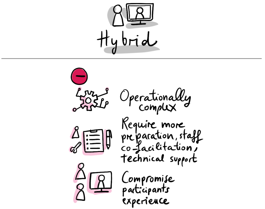 In contrast, hybrid is overwhelmingly described as the “least loved” format. Respondents emphasize the operational complexity (more staff, more preparation, more co-facilitation, stronger tech requirements) and a persistent sense that hybrid compromises the experience of at least one side of the room. For many, it is used not because it is desirable, but because circumstances force it.