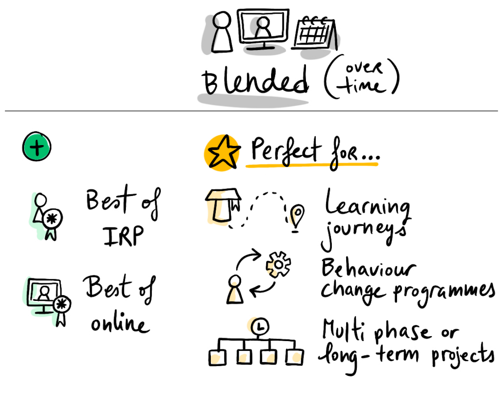 Furthermore, facilitators need to know how to guide clients in the choice of format, including notes on how hybrid sessions require higher investments in technology, staff, and preparation work, or explaining why a blended program might offer the best chance of making an impact over time.