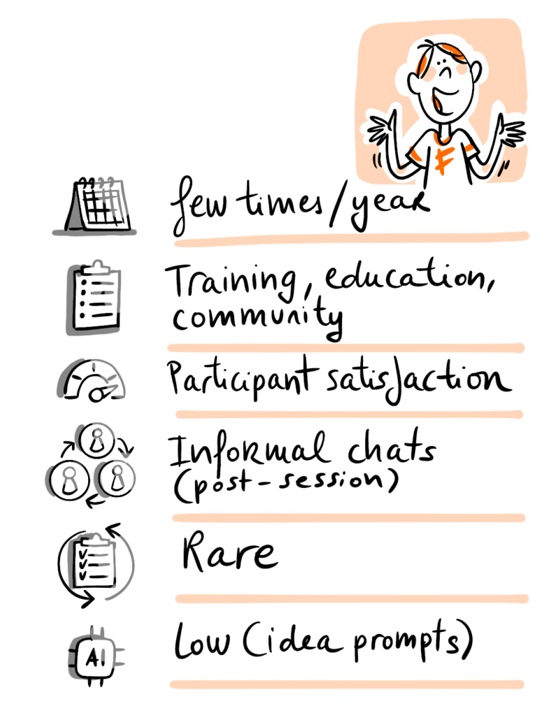 As another respondent put it: “AI is helping speed up preparation and content creation, and offering real-time insights into group dynamics, engagement, and what emerges during sessions. This frees me up and a facilitator to focus on high-impact relational work—deep listening, equity-building, and collective sensemaking—while the AI tools support logistics, analysis, and synthesis tasks.”