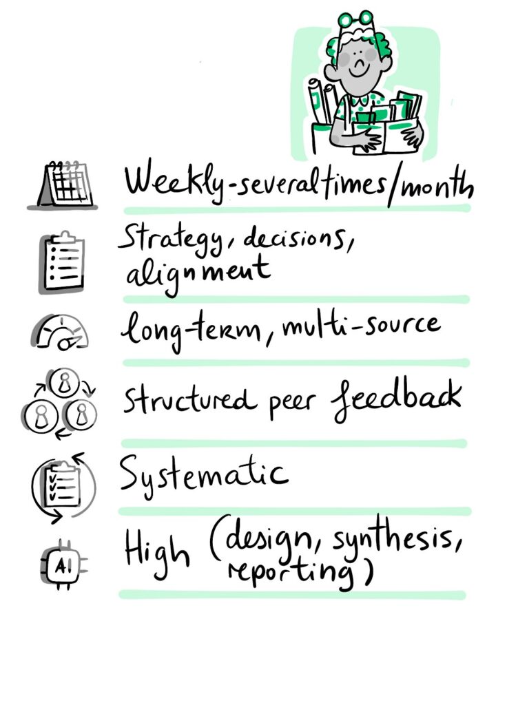 By contrast, experienced facilitators run the most complex sessions and adopt multi-dimensional evaluation practices, including long-term follow-ups and stakeholder interviews, which appear in their responses far more often than in other groups. They also make greater use of generative AI tools for tasks such as agenda design and data synthesis, indicating more confidence in orchestrating end-to-end facilitation workflows.